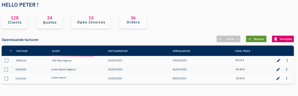 Bij Mercaflux brengt u alle klantinformatie, inclusief ras-, herkomst- en telerinformatie, samen in één overzichtelijk dashboard. U ziet offertes, bestellingen en facturen direct gekoppeld aan het juiste klantprofiel, waardoor u sneller kunt reageren op aanvragen en wijzigingen in voorraad. Geautomatiseerde herinneringen en real-time meldingen helpen u om follow-ups te doen op het perfecte moment. Tijdregistraties worden automatisch toegewezen aan de betreffende klantorder en kunnen met één klik worden omgezet in facturen.